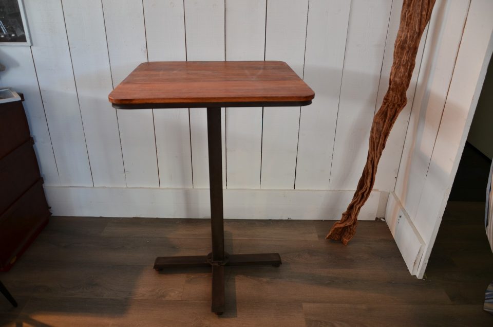 Table haute en bois qui permet de s'en servir debout ou sur une chaise haute.