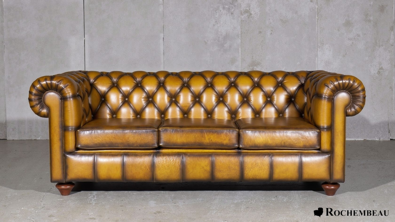 L'ensemble de nos Chesterfield sont fabriqués à la main avec soin. Nous utilisons du cuir pleine fleur de mouton, également connu sous le nom de basane, qui est teinté, patiné et ciré à la main pour un aspect naturel et élégant. Les coussins sont déhoussables et remplis de mousse haute résilience à mémoire de forme pour un confort optimal. Le dossier et les accoudoirs sont capitonnés qui sont les caractéristiques d'un parfait Chesterfield.